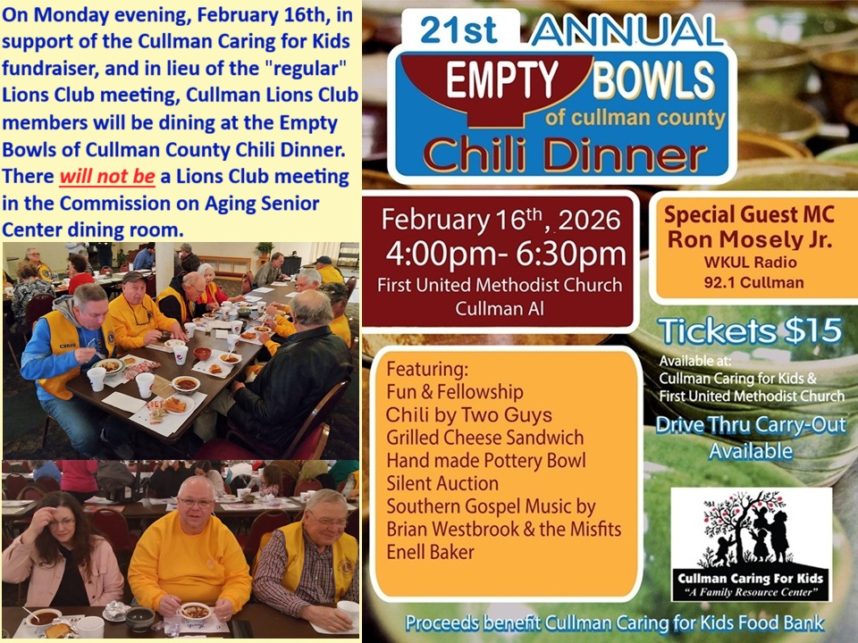 * WE SERVE * CLICK OR TAP HERE TO PAY CULLMAN LIONS CLUB MEMBERSHIP DUES ONLINE Website Directory  • Where We Meet  • Club Officers  • Membership Roster  • Newsletters & Photos  • Club History Page  • Cullman Lions Branch Club  • How To Contact Us Click *HERE* To View Our Latest "Tale Twister" Newsletter |